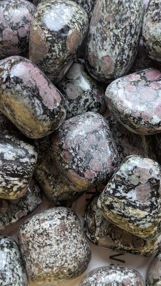 Härte: 5,5-6,5 | Farbgebung: rosa, schwarz, grau, weiß | Esoterik: Ausgeglichenheit